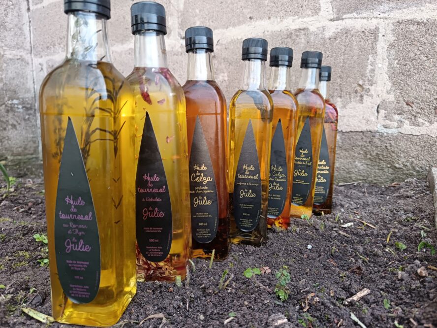 La Graine de Tournesol Oléique, est presser a froid, l’huile décanter avant la mise en bouteilles, le Thym et le Romarin infuse pour parfumer votre huile.